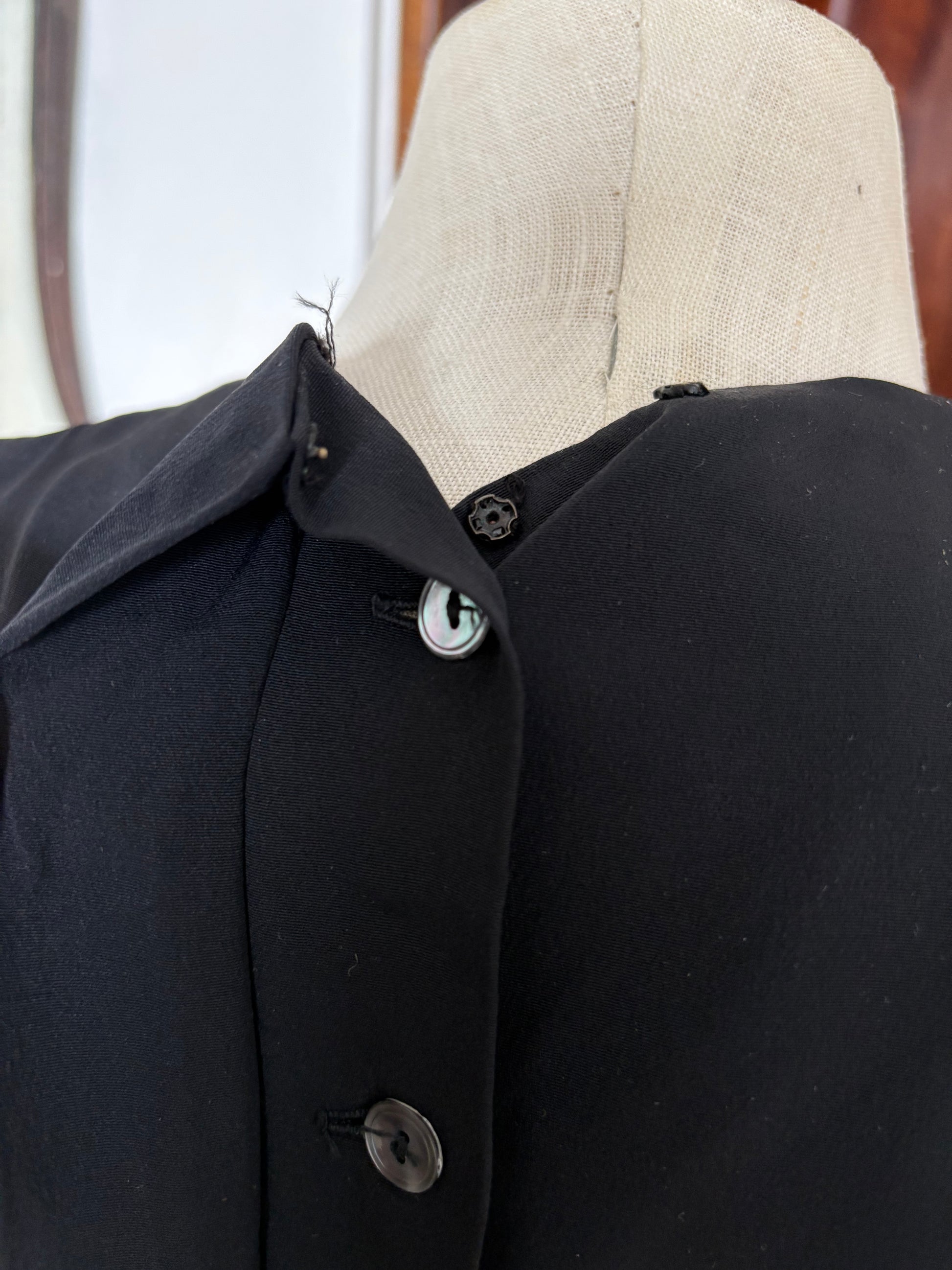 1940s, silk, hand beaded, XS, shoulder to shoulder: 14", sleeve length: 7", waist: 12", top to hem: 19"