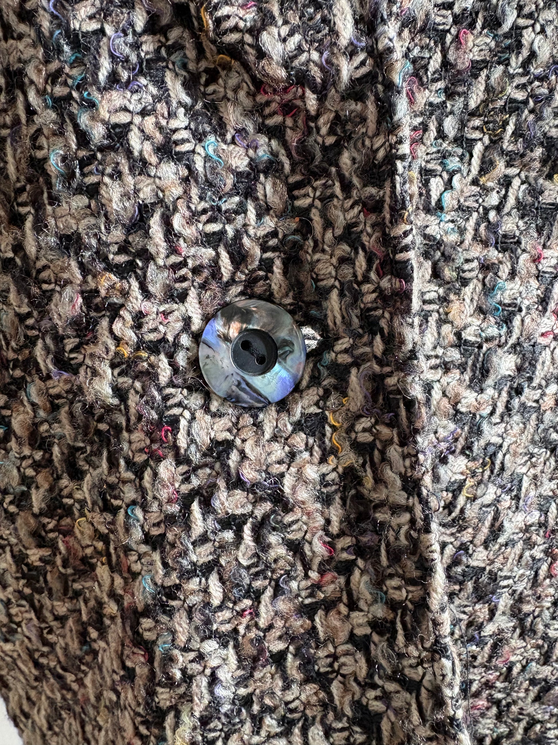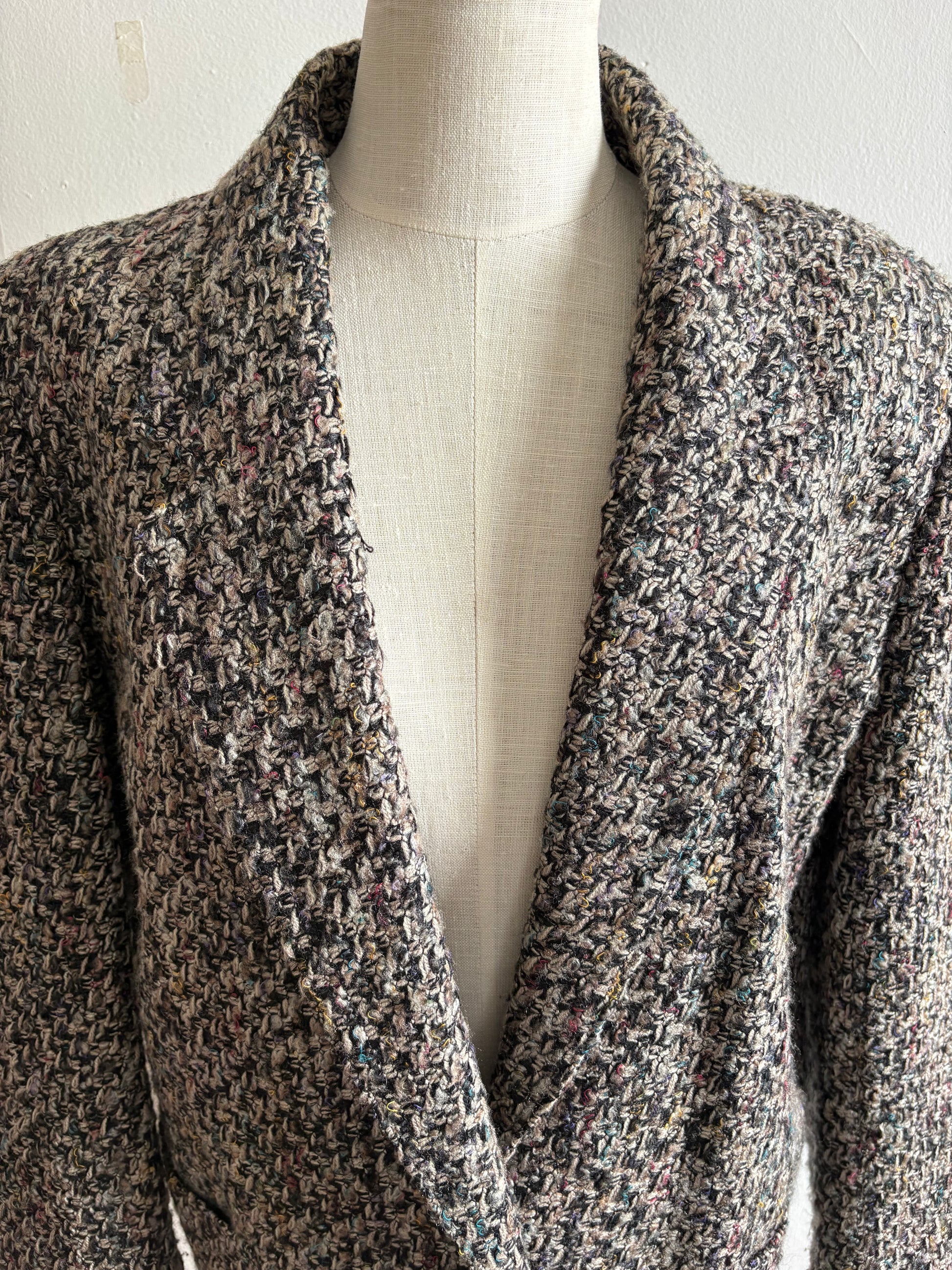 1980s, tweed, vintage size 12, shoulder to shoulder: 17", sleeve length: 20", top to hem (length): 28", oversized fit, single button closure