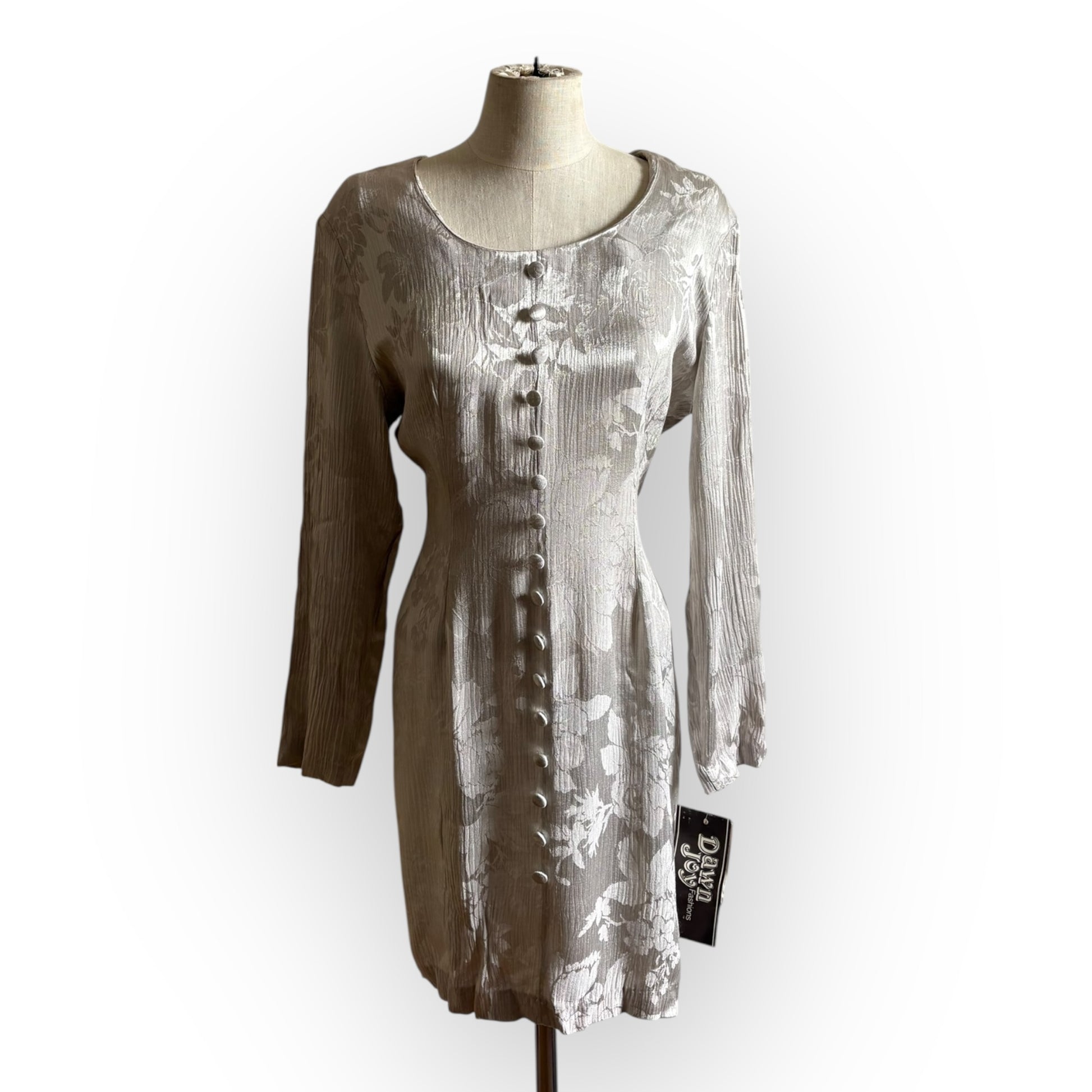 Vintage Deadstock 1990s Dawn Joy Metallic Silver Floral Mini Dress